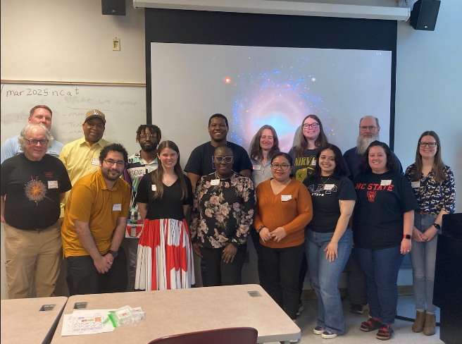 North Carolina A&T launched the first QuarkNet Center in North Carolina with a workshop on March 1st, 2025. This workshop was hosted by a team including long-time National QuarkNet Teacher Leaders Charlie Payne and Megan Alvord from the North Carolina School of Science and Math (NCSSM), QuarkNet National Staff Member Shane Wood, and NC A&T physics faculty members Shelly Lesher, Hallie Trauger, and Charlotte Wood. The workshop engaged twelve physics and physical science teachers from schools in Guilford, Durham, Wake, Randolph, and Stanly Counties in central North Carolina. The workshop included introductory hands-on examples from the Data Activities Portfolio, a research talk about Light Echoes of Type IA Supernovae from Dr. Charlotte Wood, and an introduction to particle physics detectors and data analysis. Teacher participants were enthusiastic about their first QuarkNet experience: all reported on a post-workshop survey that they were “likely” or “very likely” to use at least one activity in their classroom.